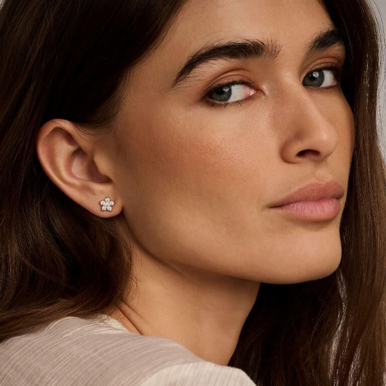 Ørestikken Midnight (M) er en funklende design, fyldt med glitrende zirkonia-sten, der fanger lyset fra alle vinkler. Den fine blomsterform kombinerer elegance og legende charme, hvilket gør den til et perfekt valg for at tilføje et strejf af glamour til ethvert look. Den er lavet i 18 karat forgyldt 925 sterlingsølv med zirkonia-sten og 8 mm i diameter.