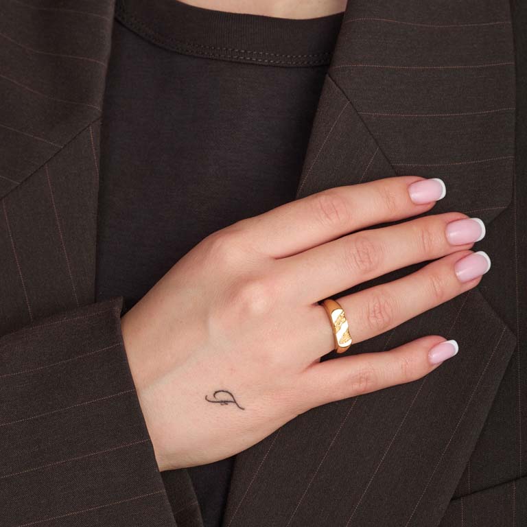 Designet er inspireret af gletschere og kombinerer en rå, is-lignende struktur med en poleret overflade. Kontrasten mellem de to giver ringen et markant design og en glans, der fanger lyset diskret.