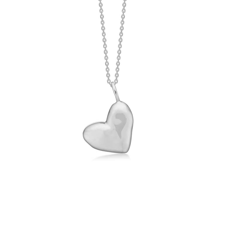 Designet er en organisk hjerteformet medaljon, der er lavet med tekstur på den ene side og en blank, poleret overflade på den anden, så den kan vendes alt efter udtryk. Den enkle form giver halskæden et tidløst look, der passer til både hverdag og særlige anledninger. Medaljonen kan åbnes og bruges til et lille billede eller graveres med en personlig besked, så den får en helt særlig betydning.