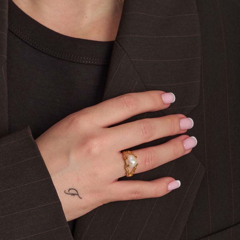 Designet er inspireret af klare vintermorgener. Perlen symboliserer sneen og er sat i en rå ringskinne med tekstur, der giver et feminint og kontrastfuldt udtryk.
