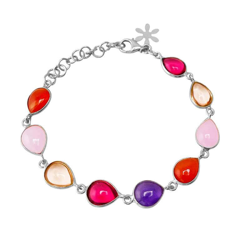 Skønt armbånd i sølv fyldet med ekslusive dråbeformede ædelsten i en skøn farvesammensætning. Armbåndet er en elegant farverig tilføjelse til enhver festlig lejlighed.