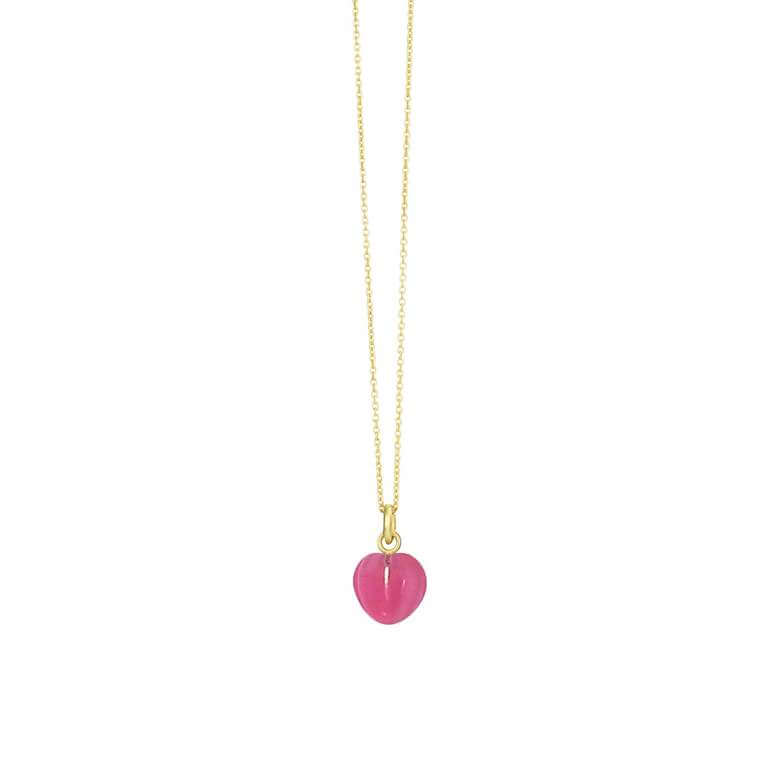 Skøn halskæde i forgyldt sølv med et smukt vedhæng af pink krystal formet som et lille sødt hjerte (8 mm).