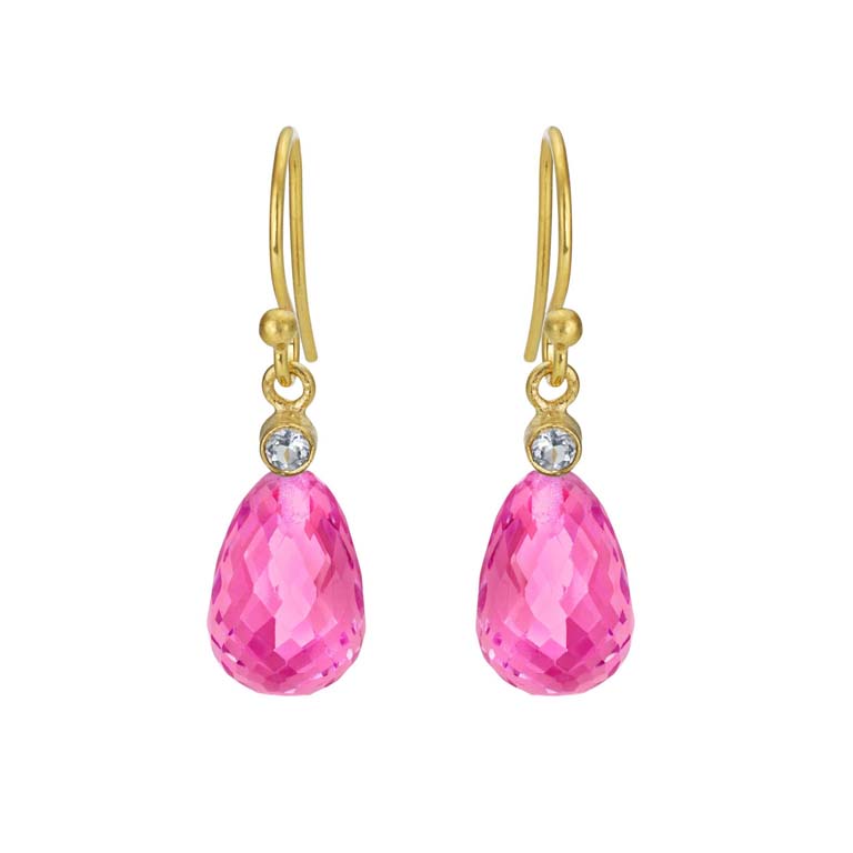 Skønne bøjleøreringe i forgyldt sølv prydet med smukke facetterede pink krystaller (8x12 mm) samt en funklende klar zirkoniasten øverst.