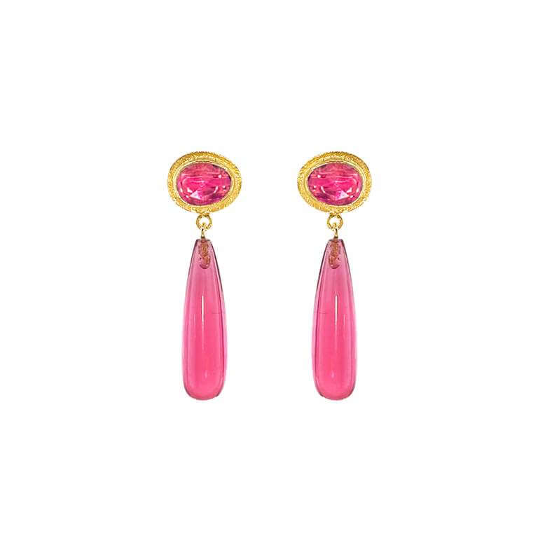 Eksklusive øreringe hvis lange dråbeformede pink krystaller, gør dem til en farverig og eksklusiv statement ørering udover det sædvanlige. Øverst sidder der facetteret oval krystal som prikken over i'et.