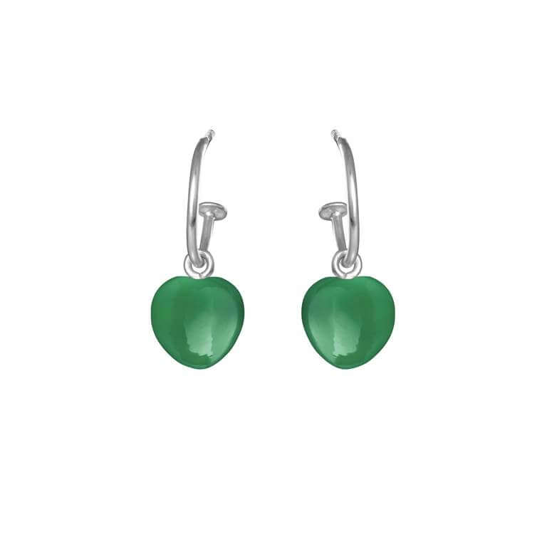 Smukke hoop øreringe i sølv med elegante hjertevedhæng af grøn agat (8 mm).