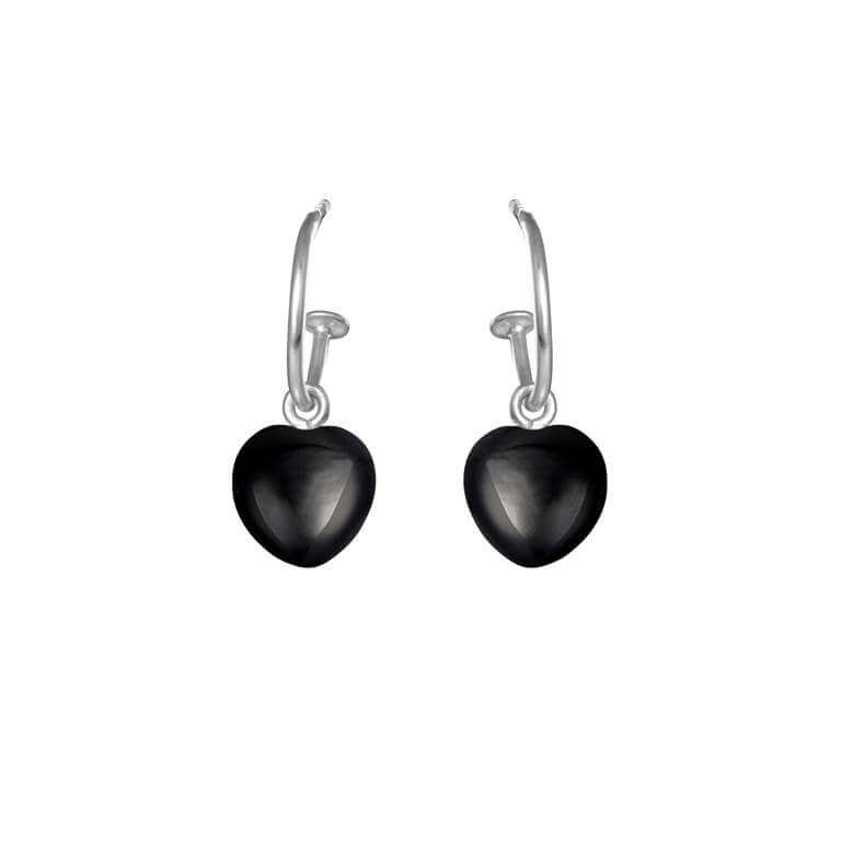 Smukke hoop øreringe i sølv med elegante hjertevedhæng af sort agat (8 mm).