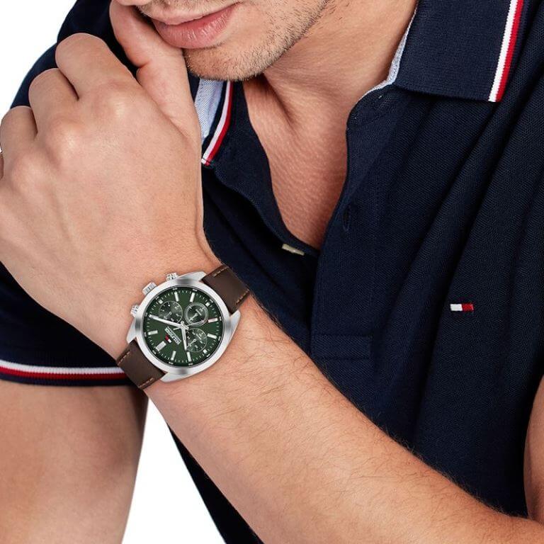Stilrent og flot ur fra Tommy Hilfiger med changerende grøn skive og detaljer i stål. Uret er udstyret med en god kraftig rem i brunt læder, samt kronograf med stopur på skiven. Dette benyttes via knapperne på siden af urets kasse.
