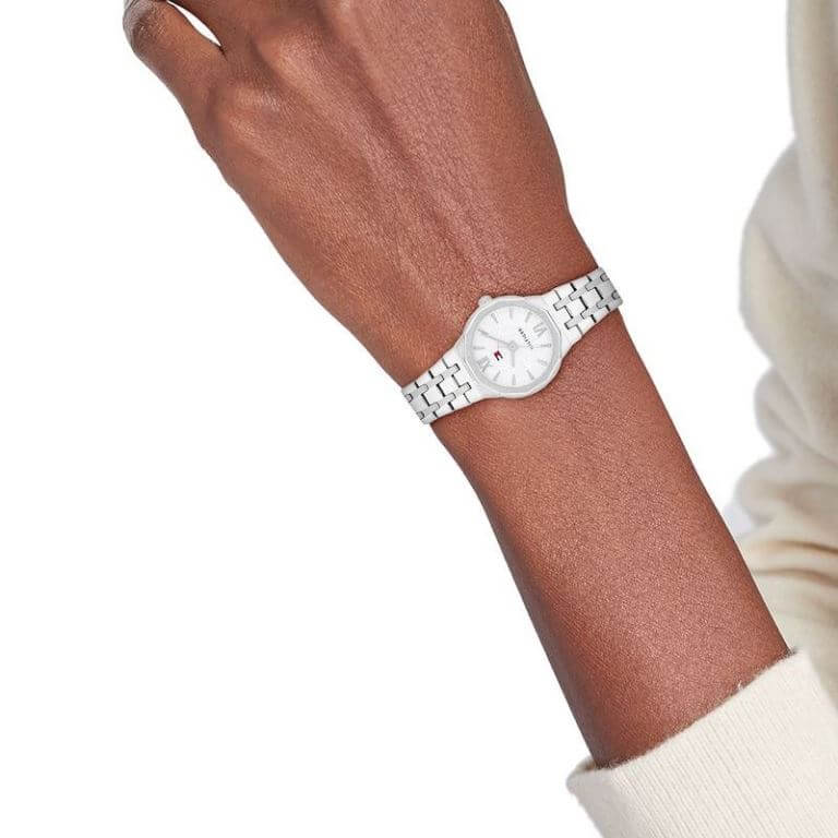 Fint og petit dameur udført i rustfrit stål. Skiven glitrer og er prydet med både Tommy Hilfiger navn og logo.