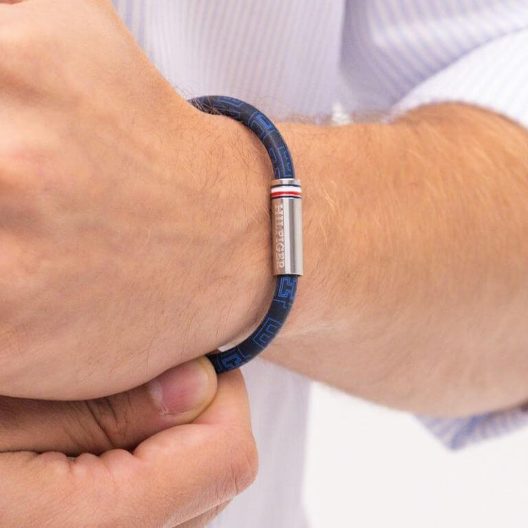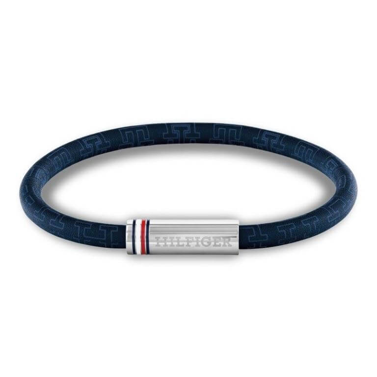 Flot og stilrent armbånd fra Tommy Hilfiger i blå læder med printet Tommy Hilfiger logo. Låsen er udført i rustfrit stål med magnet. Armbåndet måler 21 cm.