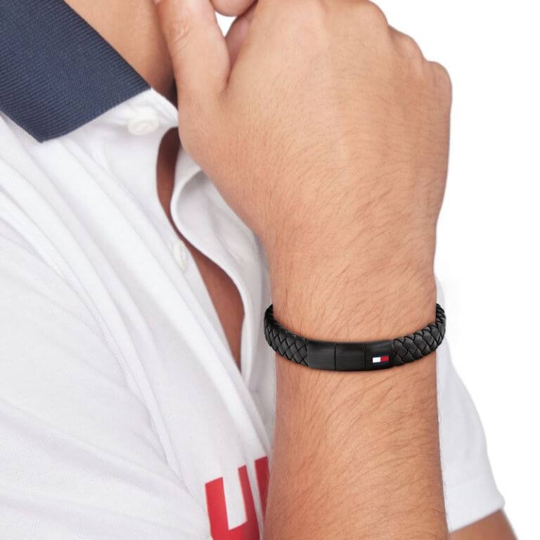 Flot og stilrent armbånd fra Tommy Hilfiger i flettet sort læder med sort stållås. Låsen er designet til at man kan fjerne midterstykket og derved afkorte armbåndet. Du er derfor sikret den helt rigtige pasform.
