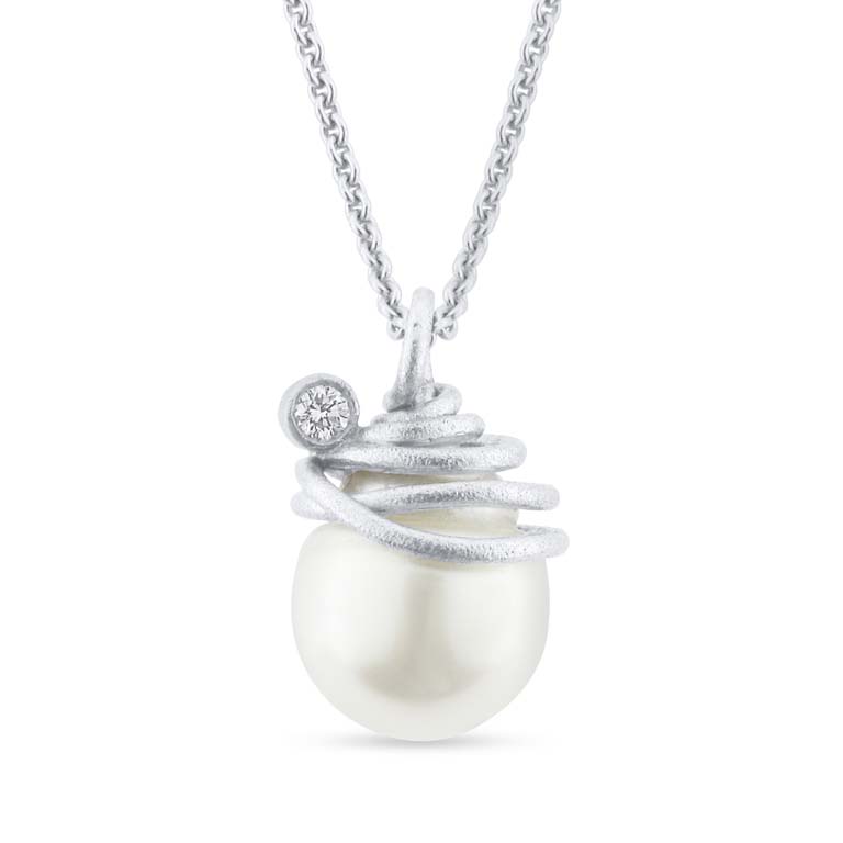 Vedhæng spiral af tråd til South Sea perle 14*16 mm. og brill. 0,10 w/vs. 14 kt. hvg.