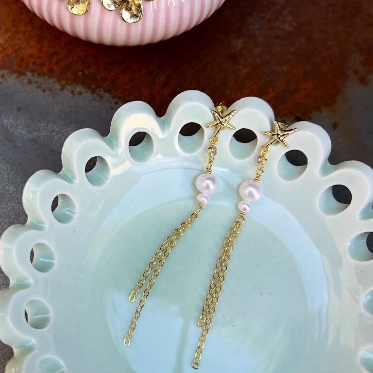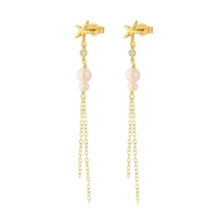 Opnå et stilrent look med Eleonora øreringene. Fremstillet i 14 karat guldbelagt sterling sølv og pyntet med en cool søstjerne, disse øreringe en fin balance mellem enkelhed og elegance. Med de fine zirkonia og smukke ferskvandsperler er de et alsidigt valg, der passer til både hverdagsbrug og særlige lejligheder.