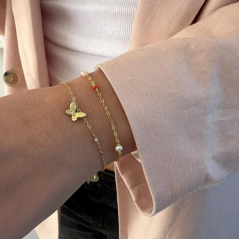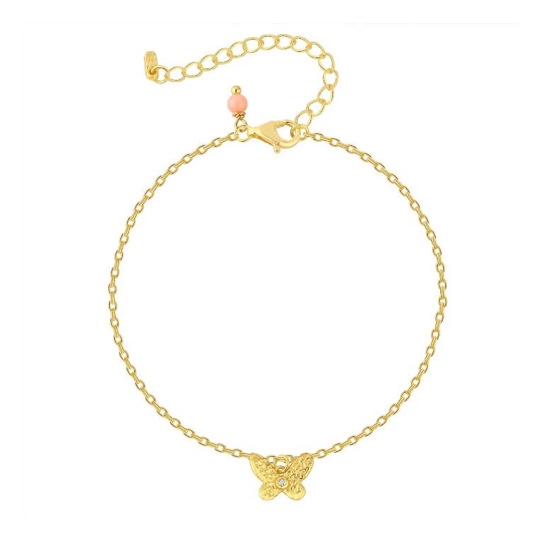 Giv dit look et friskt pust med Sidsel armbåndet i 14 karat guldbelagt 925 sterlingsølv. Det fine sommerfuglevedhæng er udsmykket med funklende zirkonia, mens en diskret koraldetalje tilføjer et blødt, farverigt touch. Et let og elegant smykke, der passer til både hverdagsbrug og særlige lejligheder.
